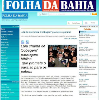 No lançamento do Plano Safra da Agricultura Familiar da Bahia 2011/2012, na presença de mil pessoas reunidas num hotel de Salvador, o ex-presidente Lula desqualificou a promessa de Nosso Senhor Jesus Cristo que garante o Céu aos pobres de coração.